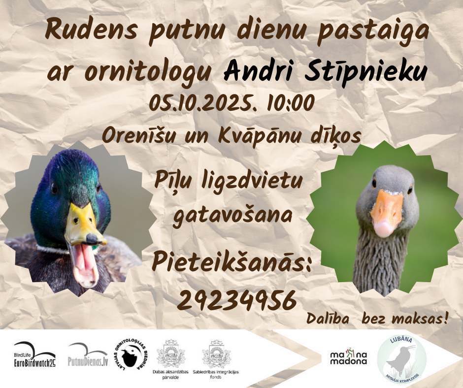 5.oktobrī 10:00 aicinām uz putnu vērošanas pastaigu pie Orenīšu un Kvāpānu dīķiem ar ornitologu Andri Stīpnieku, lai iepazītu putnus, kuri ligzdo vai caurceļo Lubāna mitrāja teritoriju. Īpašu uzmanību pievērsīsim pīļu un zosu daudzveidībai.