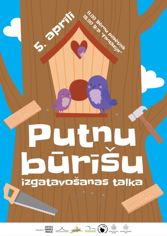 Svētdien, 5. aprīlī, ikkatrs dabas draugs tiek aicināts uz Putnu būrīšu izgatavošanas talku plkst. 11.00 Bērnu pilsētiņā (Jāņa Poruka ielā 2, Ventspilī) un bērnu parkā Fantāzija (Talsu iela 41A, ventspilī) . Sanākušie dalībnieki varēs uzzināt daudz ko jaunu un interesantu no putnu drauga Jāņa Gorobeca, un piedalīties ne tikai būrīšu gatavošanā, bet arī dažādās aktivitātēs un uzdevumos. Paši čaklākie talkotāji tiks pie dāvanām!